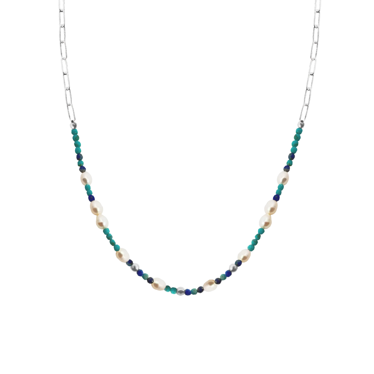Odkrijte popolno harmonijo elegance in naravne lepote v tej edinstveni ogrlici, ki združuje sijočo srebrno verižico s turkizom, lapis lazulijem in sladkovodnimi belimi biseri ter poudari individualnost in slog nosilke. Premer mineralov: 3 mm.