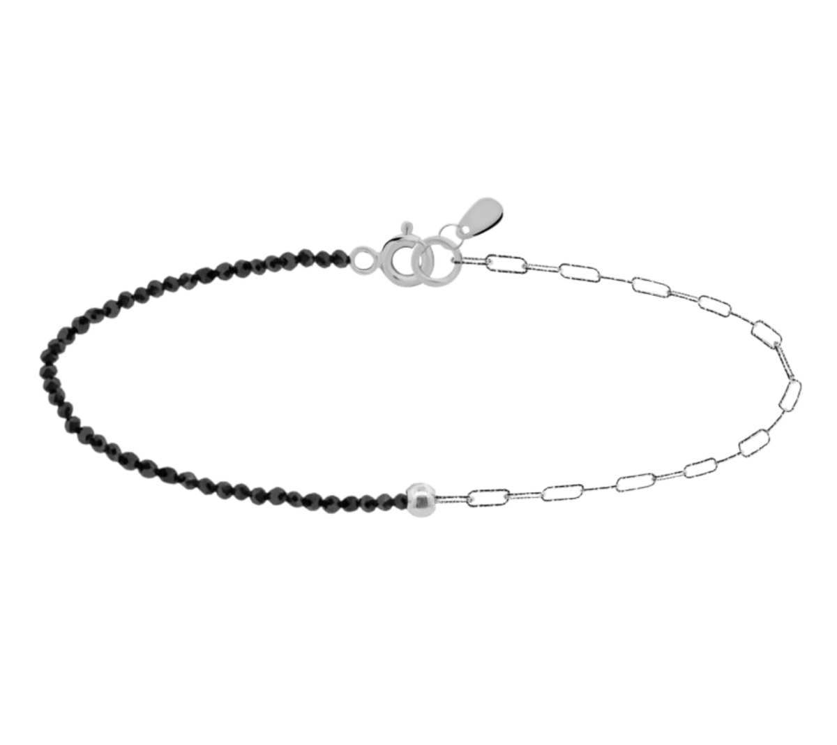 Srečanje minerala in plemenite kovine v kosu nakita. Površina ovalnih členov je gravirana, zasnovana drugače kot tradicionalne verižice. Velikost člena: 3 x 7,5 mm. Zapestnica s spinelom očara vsakogar s svojo posebno lepoto. Ne le lepa, temveč tudi zdravilni mineral. Spinel poudarja pozitivne plati osebnosti. Krepi samozavedanje in pomaga doseči uspeh.