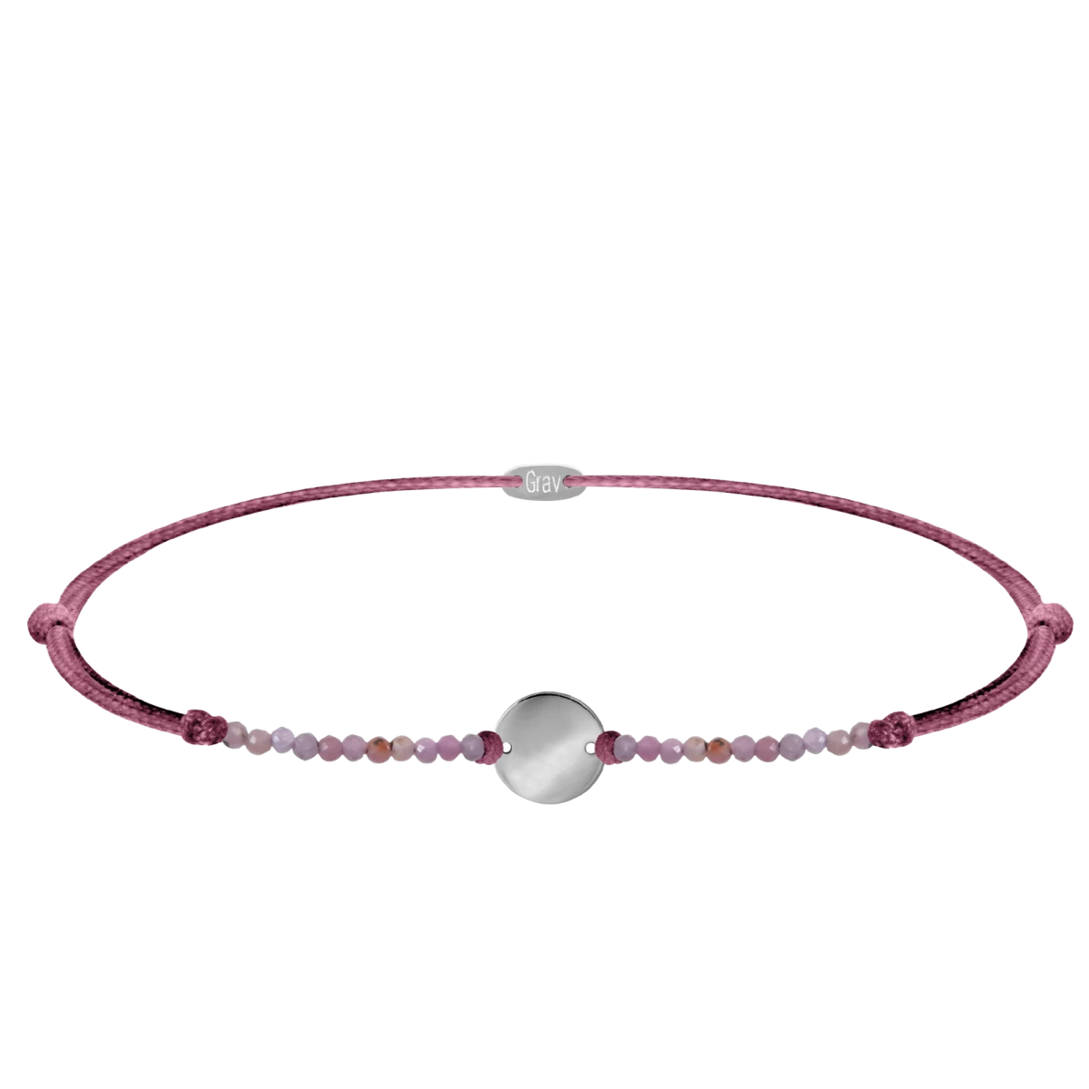 Klasičen obesek v obliki kroga, okrašen s posebnim naravnim mineralom. Pozitivno delujoči minerali tvorijo popolno kombinacijo z barvno vrvico. Mladostna in vesela zapestnica je odlična izbira za vsakodnevno nošenje.
