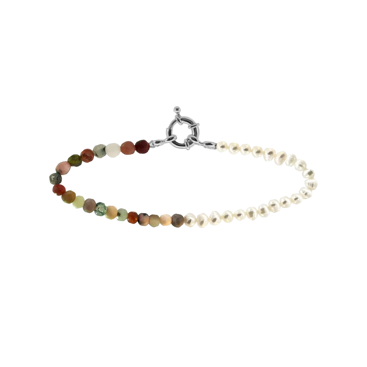 Očarljiva lepota te edinstveno oblikovane zapestnice je ustvarjena z nežnostjo kroglic in sijajem mineralov, ki žarijo v jesenskih barvah (kalcedon, ahat, kremen, marmor, kalcit); eleganten srebrn karabin dodatno poudari naravno energijo, ki jo dajejo minerali, in edinstven videz.