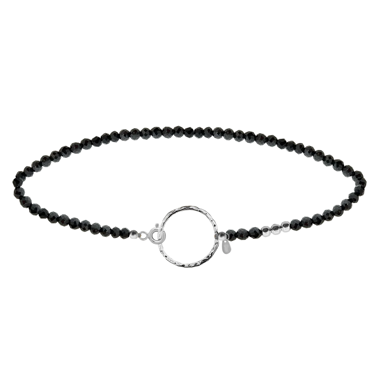 Naj naravna lepota spinela in njegov globok, skrivnosten sijaj očarata v tej posebni zapestnici, ki združuje eleganten okrogel obesek z vgravirano površino in tri sijoče srebrne kroglice, zato je popolna izbira za tiste, ki imajo radi nežne, a hkrati izrazite dodatke.