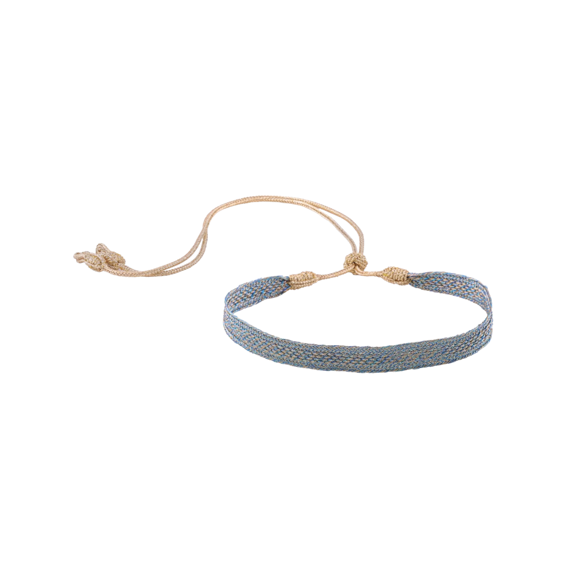Ročno izdelana choker ogrlica, čas izdelave je več kot 3 ure. Material se v arabščini imenuje “Sfifa”, izdelan je iz tradicionalnega tkanja zlatih niti. S svojo očarljivo izbiro barv ta kos poživlja videz. Tkanina je vodoodporna, vendar je za daljšo življenjsko dobo ne nosite med tuširanjem, hišnimi opravili ali vadbo. Zaradi drsnih vozlov je velikost ogrlice mogoče prilagoditi fleksibilno.
