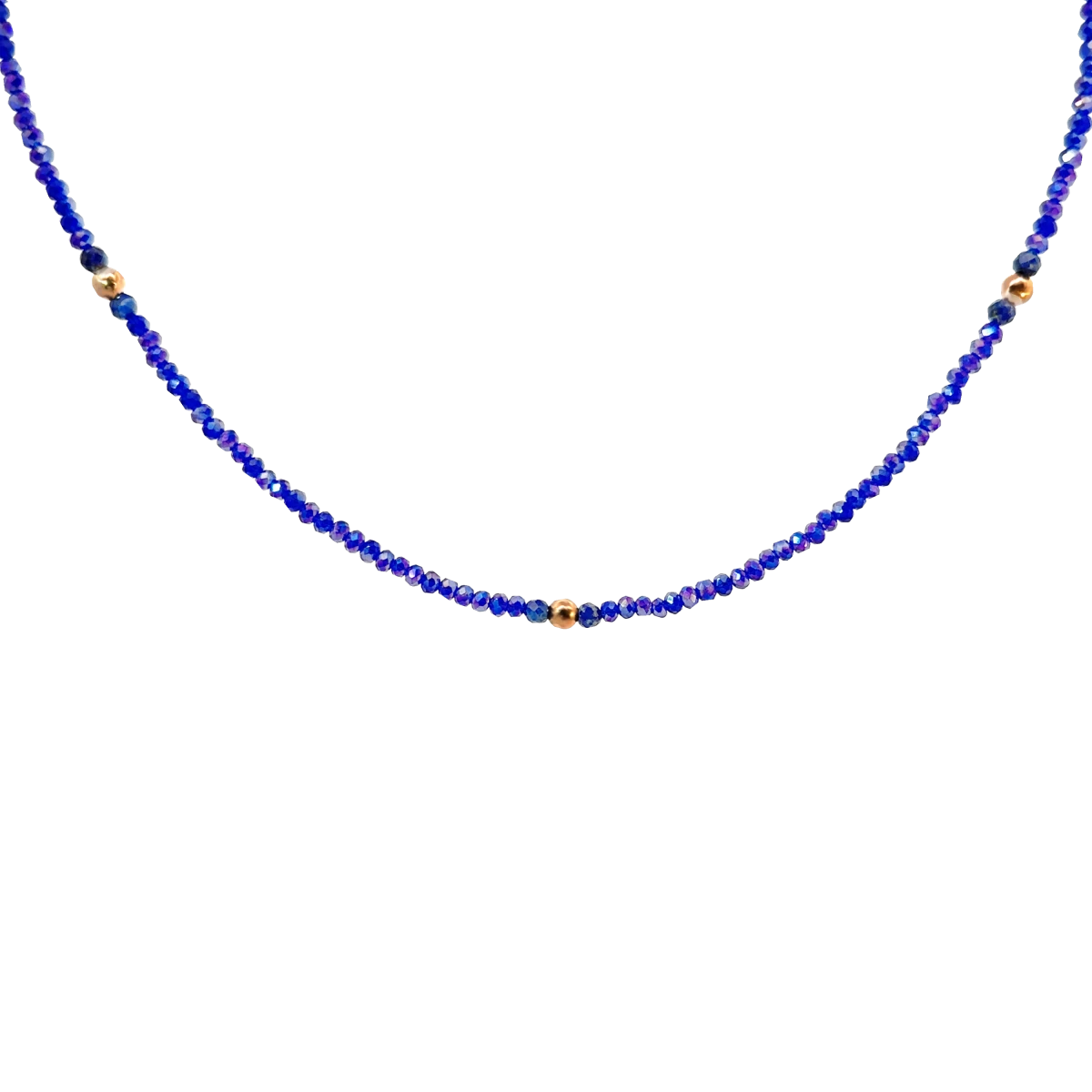 Edinstvena, ročno izdelana ogrlica z lapis lazulijem in kroglicami iz srebra čistine 925, pozlačenimi z rdečim zlatom. Za ljubitelje resnično trendovskih kosov. Lesk mineralov naredi opravo še bolj sijočo in barvito.