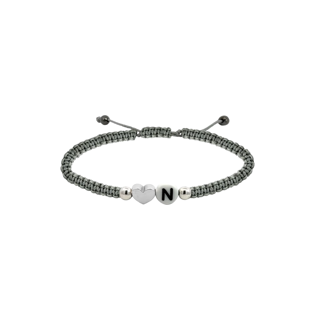 Izberi zapestnico, izdelano z makrame tehniko iz izjemno kakovostne, proti trganju odporne niti, unikatno zaradi natančne ročne izdelave in okrasnih elementov, obogatenih s srebrnim srcem, akrilno črko in dvema srebrnima kroglicama.
