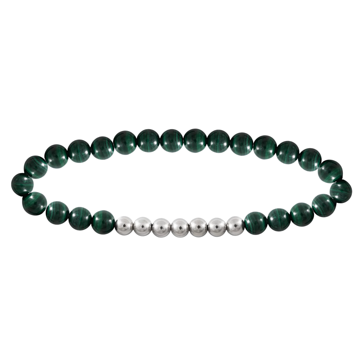 Ta kos iz kolekcije moških zapestnic pritegne pozornost s svojo globoko zeleno poudarjeno barvo in eleganco srebrnega tona. Za okrepitev učinkov malahita ga nosite na levem zapestju. Pomaga pri jasnosti, ustvarja ravnovesje in harmonijo ter nudi čustveno zdravljenje. Srebrne kroglice prekinjajo prevlado zelene barve in ustvarjajo popolno harmonijo.