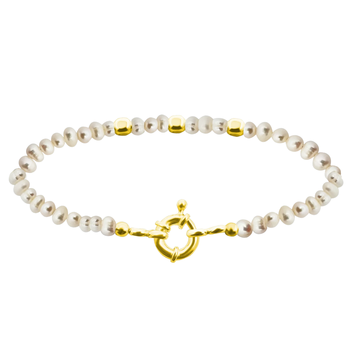 Srečanje prefinjenosti in sodobnega dizajna v tej zapestnici, kjer niz biserov prekinjajo trije zaobljeni dodatki v obliki kocke iz srebra, prevlečenega z 18 karatnim zlatom, izrazita zaponka pa poskrbi za spektakularen videz.