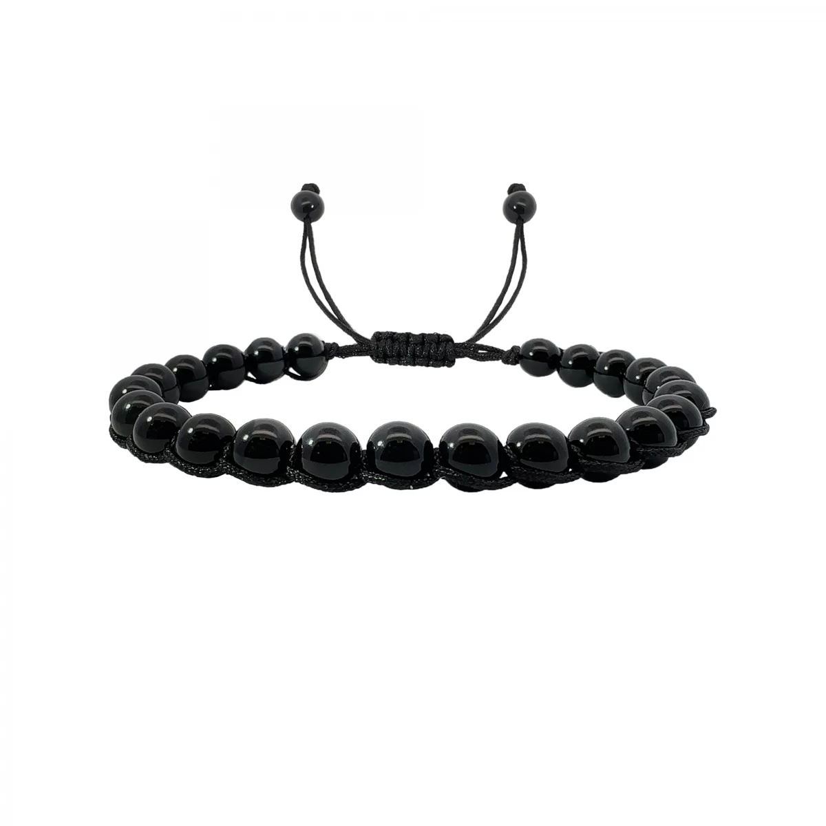 Zapestnica iz kroglic črnega oniksa, nanizana z uporabo tehnike makrame. Premer kroglic: 6 mm.