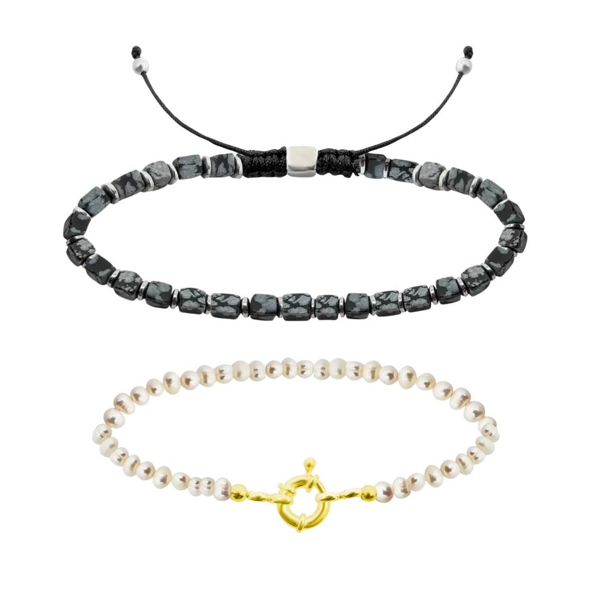 Zgrabite priložnost in si priskrbite enega od edinstvenih kompletov partnerskih zapestnic, ki vključuje moško zapestnico iz snežinkastega obsidiana, izdelano v tehniki makrame, ter žensko zapestnico iz bele sladkovodne biserne školjke z velikim karabinom iz pozlačenega srebra 925, popoln simbol povezanosti in harmonije. Idealen dodatek za pare, ki želijo s pomočjo nakita izraziti svojo vez in usklajen slog.