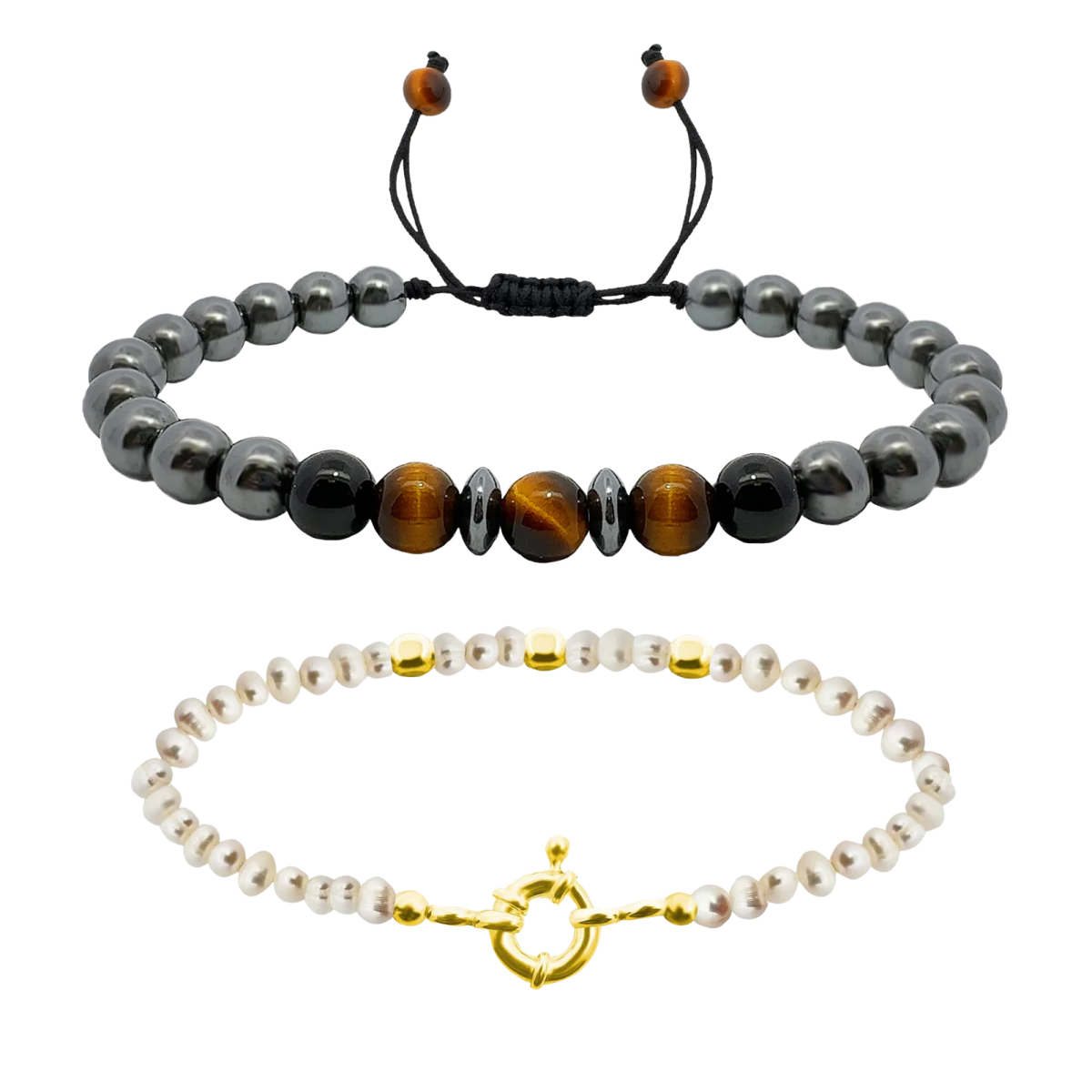 Zasnovan za pare in prijatelje, ki želijo skupaj doživeti stilsko in harmonično življenje, je ta par zapestnic na voljo kot moška makrame zapestnica z minerali tigrovo oko, črni oniks in hematit, ki pomirjajo um, ter kot ženska zapestnica iz sladkovodnega belega bisera z velikim karabinastim zapiralom iz srebra 925, prevlečenim z rumenim zlatom, izraz elegance.